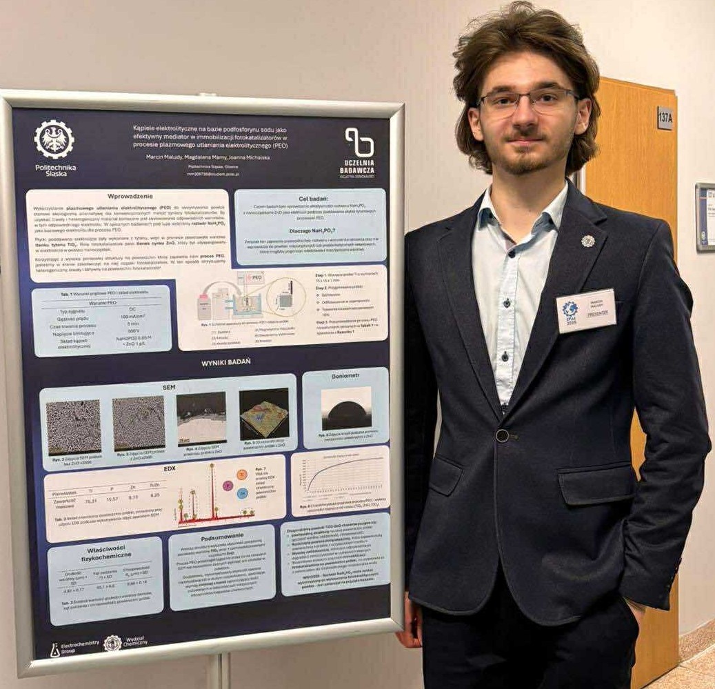 Ale na początku cofnijmy się na chwilę do grudnia i do konferencji EPAE2025 w której udział brał również Marcin Maludy realizujący pracę badawczą pod nadzorem Dr hab. inż. Joanny Michalskiej oraz mgr inż. Magdaleny Marny. Marcin zaprezentował poster pt. "Kąpiele elektrolityczne na bazie podfosforynu sodu jako efektywny mediator w immobilizacji fotokatalizatorów w procesie plazmowego utleniania elektrolitycznego (PEO)".
