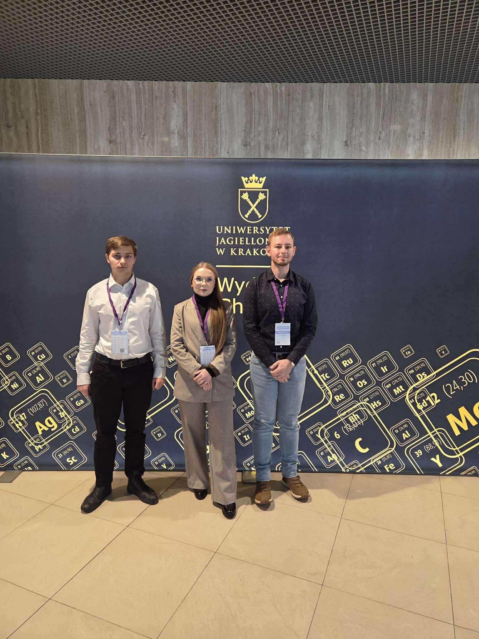W dniach 9-10.01.2026 na Wydziale Chemii Uniwersytetu Jagiellońskiego w Krakowie odbyła się VI Ogólnopolska Konferencja Naukowa "Bliżej Chemii", na której aż trzech Naszych Członków zaprezentowało postery prezentujące wyniki ich prac naukowych realizowanych w ramach projektu PBL pt. "Projektowanie i zastosowanie metaloorganicznych cieczy jonowych jako nowej klasy zrównoważonych katalizatorów w reakcjach chemii organicznej" pod opieką naukową dr. inż. Piotra Latosa na Katedrze Technologii Chemicznej Organicznej i Petrochemii. Anita Procek "Opracowanie innowacyjnych metaloorganicznych cieczy jonowych jako katalizatorów w procesach fine chemicals", Mateusz Pilszek "Zastosowanie metalicznych cieczy jonowych jako efektywnych katalizatorów kondensacji Knoevenagela", Janusz Pryciuk "Wykorzystanie cieczy jonowych w recyklingu metali z elektrolitu baterii jonowych".